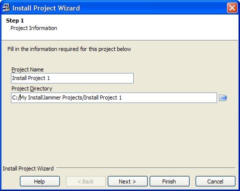 Step 1 of the wizard asks you for some basic project information. This information is all internal to InstallJammer and tells it where you want to save your project and what you want to call the project.
