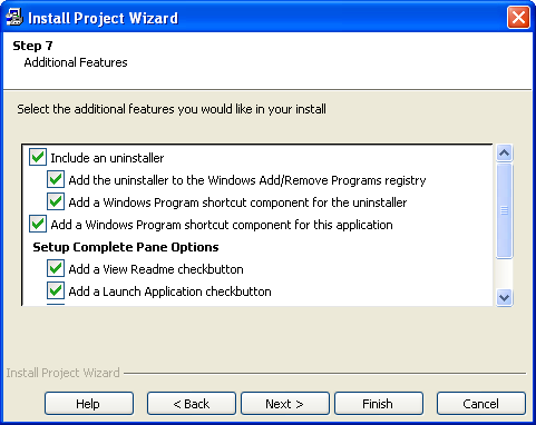 Step 7 lets you select some additional features you might like to add to your installer. Most of the features are switched on by default, as they are common to most installers used today.