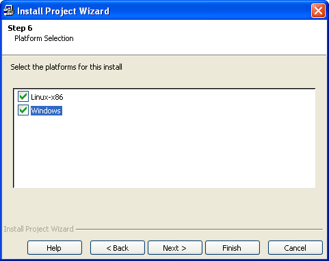 Step 6 presents you with a list of platforms supported by your installation of InstallJammer and asks you to pick which ones you plan to install on. You need only pick a single platform for your installer if your software is not multiplatform.